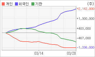 | 기관과 개인은 순매도, 외국인은 순매수(한달누적) 기관이 15일연속 주식을 팔고 있는 반면 외국인은 23일연속 주식을 사고 있다. 4주간을 기준으로 보면 외국인이 초반에 동종목을 순매수한 이후에 기세를 이어가며 2,141,357주를 순매수한 반면, 기관은 순매수에서 순매도로 반전되면서 806,268주를 순매도했고, 개인들도 매도쪽으로 방향을 잡으면서 1,335,089주를 순매도한 것으로 집계됐다. |