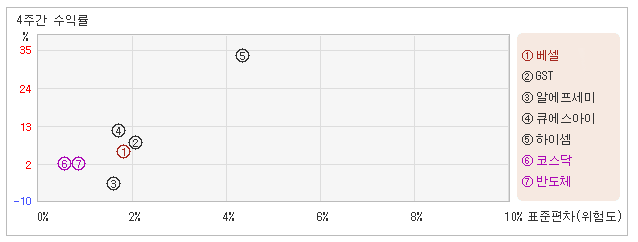 | 위험대비수익률 2.2로 하위권, 업종지수보다 높아 30일 오후 1시50분 현재 전일대비 2.69% 오른 6,110원을 기록하고 있는 베셀은 지난 1개월간 4.07% 상승했다. 동기간 동안 주가움직임의 위험지표인 표준편차는 1.8%를 기록했다. 이는 반도체 업종내에서 주요종목들과 비교해볼 때 베셀의 월간 변동성이 상대적으로 큰 편은 아니었으나 주가상승률도 또한 낮은 수준을 유지했다는 것이다. 최근 1개월을 기준으로 베셀의 위험을 고려한 수익률은 2.2를 기록했는데, 변동성은 중간 수준이었으나 전체적인 관점에서의 위험대비 수익률은 다소 부진했다. 그러나 반도체업종의 위험대비수익률 0.5보다는 높았기 때문에 업종대비 성과는 긍정적이라고 할 수 있다. 다음으로 업종과 시장을 비교해보면 베셀이 속해 있는 반도체업종은 코스닥지수보다 변동성과 수익률이 모두 높은 모습이다. 다시 말하면 동업종에 탄력이 붙으면서 지수대비 초과상승했다는 의미이다. |