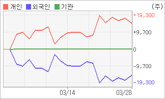 | 기관/개인 순매수, 외국인은 순매도(한달누적) 3월28일부터 전일까지 외국인이 2거래일 연속 순매수를 보였다. 4주간을 기준으로 보면 기관이 초반에 동종목을 순매수한 이후에 큰 변화가 나타나지 않음에도 불구하고 1주를 순매수했고, 개인들도 순매수량을 늘리며 14,805주를 순매수했다. 반면 그 동안 외국인은 매도 우위를 지속하면서 14,806주를 순매도했다. |