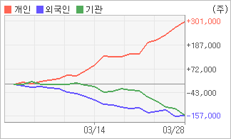 | 외국인과 기관은 순매도, 개인은 순매수(한달누적) 3월20일부터 기관이 8거래일 연속 순매도 행진을 벌이고 있다. 4주간을 기준으로 보면 외국인이 매도 우위를 지속하면서 151,470주를 순매도했고, 기관도 매도 관점으로 접근하면서 149,270주를 순매도했지만, 개인은 오히려 순매수량을 늘리며 300,740주를 순매수했다. |