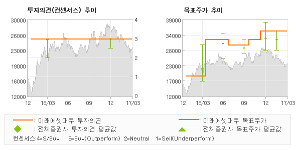 미래에셋대우의 동종목에 대한 최근 1년동안의 투자의견은 전체적으로 큰 변화없이 유지되고 있다. 목표주가는 2016년4월 30,000원이 저점으로 제시된 이후에 최근에는 35,000원까지 상향조정되고 있다.