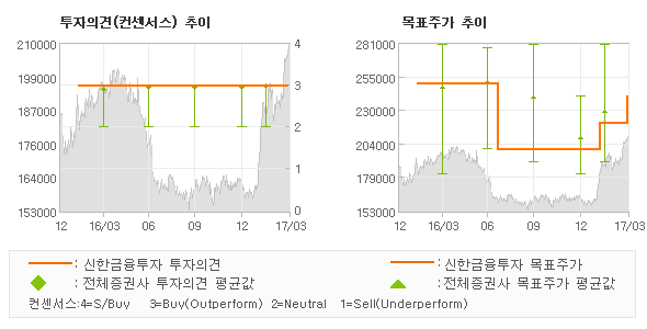 신한금융투자의 동종목에 대한 최근 1년동안의 투자의견은 전체적으로 큰 변화없이 유지되고 있다. 목표주가는 2016년5월 250,000원까지 높아졌다가 2016년7월 200,000원을 최저점으로 목표가가 제시된 이후 최근에 240,000원으로 새롭게 조정되고 있다.