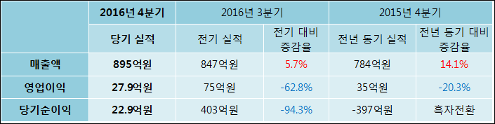 03월 31일 삼보판지(023600)의 2016년 4분기 연결 확정 실적이 발표됐다. 전년 같은 기간 대비해서 매출액은 14.14% 상승하여 895억원을 기록했다. 영업이익은 20.31% 감소하여 27.9억원라고 발표됐다. 당기순이익은 22.9억원으로 -397억원에서 흑자전환되었다.