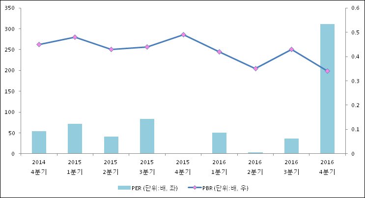 주가가 1주당 수익의 몇배가 되는지 나타내는 주가수익비율(PER)은 310.89배로 나타났다. 직전분기 PER은 36.7배로 이번 분기에 상승했다.주가가 1주당 순자산의 몇배인지 알려주는 주가순자산비율인 PBR은 0.34배이다. 지난해 동기 PBR은 0.49배로 이번 4분기 PBR이 하락했다.
