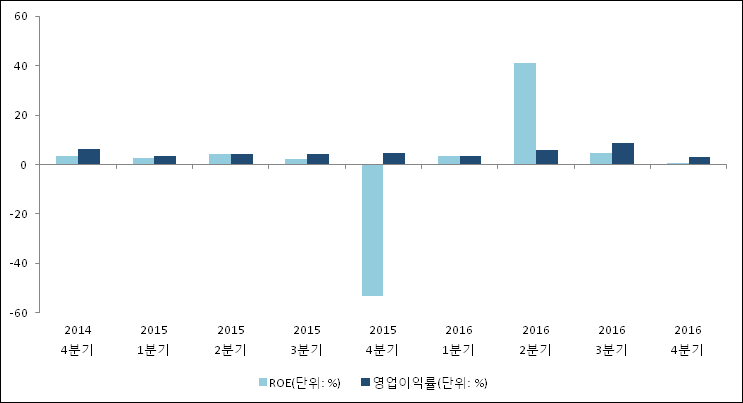 이번분기 기준으로 추정되는 삼보판지의 자기자본이익률(ROE)은 0.4%로 나타났다. 전년 동기인 2015년 4분기 ROE는 -53.4%로 이번 분기에 53.8%p 상승했다. 한편 동종목의영업이익률은 3.1%이다. 지난해 동기 영업이익률은 4.5%로 이번 4분기에 1.4%p 하락했다.