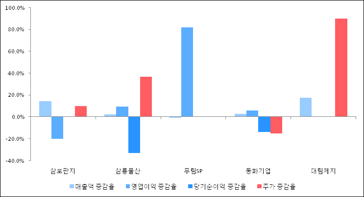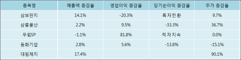 다음은 삼보판지와 동일 업종 내 비교 그룹 종목의 각각 최근 실적의 전년 동기 대비 성장률이다. 삼보판지의 매출액 증감율은 타 종목 대비 우수한 편이다. 그리고 주가 상승률은 양호한 편이다.