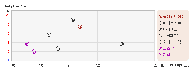 | 업종지수와 비교해서 변동성 대비 성과는 좋은 편 3일 오후 2시50분 현재 전일대비 6.43% 오른 18,200원을 기록하고 있는 콜마비앤에이치는 지난 1개월간 13.75% 상승했다. 같은 기간동안에 위험를 나타내는 지표인 표준편차는 2.4%를 기록했다. 이는 제약 업종내에서 주요종목들과 비교해볼 때 콜마비앤에이치의 월간 주가수익률이 상당히 높았던 만큼 변동성도 다소 높은 수준을 유지했다는 뜻이다. 최근 1개월을 기준으로 콜마비앤에이치의 위험을 고려한 수익률은 5.7을 기록했는데, 변동성은 높은 편이나 위험대비 수익률은 그렇게 높지 않다. 그럼에도 제약업종의 위험대비수익률 -0.2보다는 높았기 때문에 업종대비 성과는 긍정적이라고 할 수 있다. 다음으로 업종과 시장을 비교해보면 콜마비앤에이치가 속해 있는 제약업종은 코스닥지수보다 변동성은 높고, 등락률은 낮은 모습이다. 하락할 때 지수보다 탄력을 받고 있다는 의미이다. |