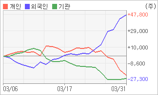| 기관과 개인은 순매도, 외국인은 순매수(한달누적) 3월24일부터 전일까지 외국인이 6거래일 연속 동종목을 사들였다. 4주간을 기준으로 보면 외국인이 초반에 동종목을 순매수한 이후에 기세를 이어가며 47,799주를 순매수한 반면, 기관은 매도 관점으로 접근하면서 25,963주를 순매도했고, 개인들도 매도 우위로 반전되면서 21,836주를 순매도한 것으로 집계됐다. |