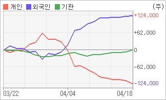 | 기관과 개인은 순매도, 외국인은 순매수(한달누적) 전일까지 기관이 7일 연속, 외국인이 2일 연속 각각 동종목을 순매수 했다. 4주간을 기준으로 보면 외국인이 초반에 동종목을 순매수한 이후에 기세를 이어가며 123,828주를 순매수한 반면, 기관은 매도 우위를 보이면서 82주를 순매도했고, 개인들도 매도쪽으로 방향을 잡으면서 123,746주를 순매도한 것으로 집계됐다. |