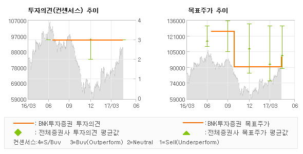 오늘 BNK투자증권에서 발표된 '매수(유지)'의견 및 목표주가 100,000원은 전체 컨센서스 대비해서 대체적으로 평균치에 해당하는 수준으로, 이번 의견은 동종목에 대한 전체적인 흐름에서 크게 벗어나지 않은 것으로 파악되며 목표가평균과 대비해서 미미한 차이가 나는 것으로 집계되었다. 참고로 최근에 목표주가를 가장 공격적으로 제시한 이베스트투자증권에서 투자의견 '매수(유지)'에 목표주가 130,000원을 제일 보수적인 의견을 제시한 NH투자증권에서 투자의견 '매수(유지)'에 목표주가 84,000원을 제시한 바 있다.