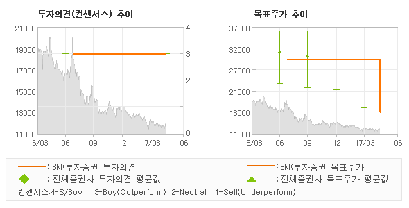 오늘 BNK투자증권에서 발표된 '매수(신규)'의견 및 목표주가 16,000원은 전체 컨센서스 대비해서 대체적으로 평균치에 해당하는 수준으로, 이번 의견은 동종목에 대한 전체적인 흐름에서 크게 벗어나지 않은 것으로 파악되며 목표가평균 대비 3%정도 미달하고 있는 것으로 집계되었다. 참고로 최근에 목표주가를 가장 공격적으로 제시한 신영증권에서 투자의견 '매수'에 목표주가 17,000원을 제시한 바 있다.