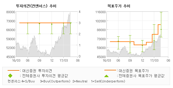 대신증권의 동종목에 대한 최근 1년동안의 투자의견은 전체적으로 큰 변화없이 유지되고 있다. 목표주가는 2016년4월 63,000원이 저점으로 제시된 이후에 최근에는 95,000원까지 상향조정되고 있다.