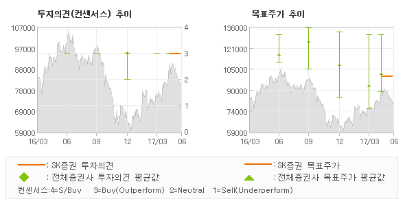오늘 SK증권에서 발표된 '매수(유지)'의견 및 목표주가 100,000원은 전체의견에 수렴하면서 시장의 평균적인 기대감이 비교적 객관적으로 표현된 것으로 풀이되며 목표가평균과 대비해서 미미한 차이가 나는 것으로 집계되었다. 참고로 최근에 목표주가를 가장 공격적으로 제시한 IBK투자증권에서 투자의견 '매수'에 목표주가 120,000원을 제일 보수적인 의견을 제시한 NH투자증권에서 투자의견 '매수(유지)'에 목표주가 84,000원을 제시한 바 있다.