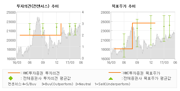 오늘 HMC투자증권에서 발표된 '매수'의견 및 목표주가 25,000원은 전체 컨센서스 대비해서 대체적으로 평균치에 해당하는 수준으로, 이번 의견은 동종목에 대한 전체적인 흐름에서 크게 벗어나지 않은 것으로 파악되며 목표가평균 대비 2.3% 초과하고 있는 것으로 집계되었다. 참고로 최근에 목표주가를 가장 공격적으로 제시한 부국증권에서 투자의견 '매수(유지)'에 목표주가 27,000원을 제일 보수적인 의견을 제시한 동부증권에서 투자의견 'HOLD(유지)'에 목표주가 21,000원을 제시한 바 있다.