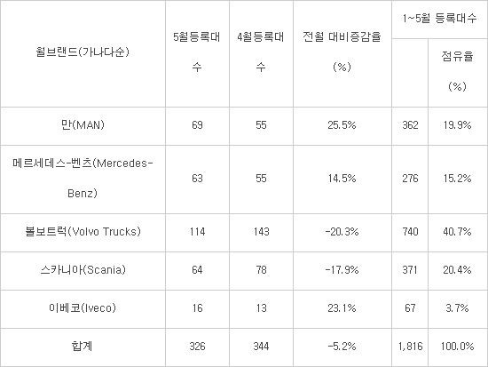 1~5월 점유율에서도 볼보트럭은 40.7%로 1위를 차지했다. 스카니아(20.4%)와 만(19.9%)이 2위 다툼 중이다. 차종별로는 지난달 특히 수입 특장차(142대), 트랙터(126대) 등이 많이 팔렸다.