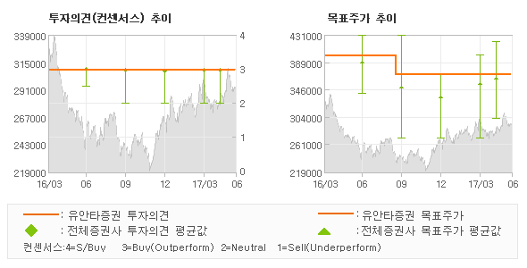 유안타증권의 동종목에 대한 최근 1년동안의 투자의견은 전체적으로 큰 변화없이 유지되고 있다. 목표주가는 2016년6월 400,000원까지 높아졌다가 2016년9월 370,000원을 최저점으로 목표가가 제시된 이후 최근에도 370,000원으로 제시되고 있다.