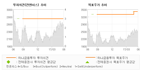 오늘 하나금융투자에서 발표된 '매수'의견 및 목표주가 3,410원은 전체 컨센서스 대비해서 대체적으로 평균치에 해당하는 수준으로, 이번 의견은 동종목에 대한 전체적인 흐름에서 크게 벗어나지 않은 것으로 파악되며 목표가평균과 대비해서 미미한 차이가 나는 것으로 집계되었다. 참고로 최근 증권사 매매의견 중에서 제시한 바 있다.