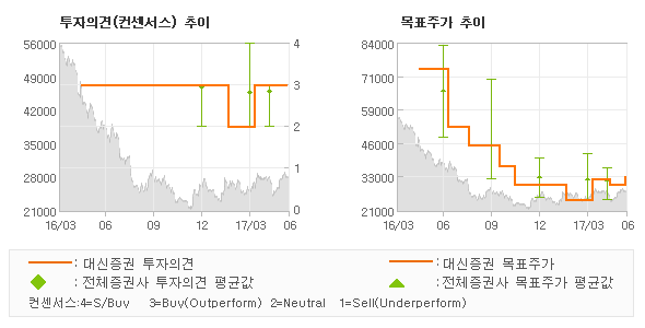 대신증권의 동종목에 대한 최근 1년동안의 투자의견은 전체적으로 큰 변화없이 유지되고 있다. 목표주가는 2016년5월 74,000원까지 높아졌다가 2017년2월 24,000원을 최저점으로 목표가가 제시된 이후 최근에 33,000원으로 새롭게 조정되고 있다.