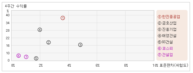 | 업종지수와 비교해서 등락폭 대비 수익률은 높아 14일 오전 9시35분 현재 전일대비 7.66% 오른 5,060원으로 강세를 보이고 있는 한진중공업은 지난 1개월간 37.43% 상승했다. 같은 기간동안에 위험를 나타내는 지표인 표준편차는 3.6%를 기록했다. 이는 건설업 업종내에서 주요종목들과 비교해볼 때 한진중공업의 월간 주가수익률이 가장 높았던 만큼 변동성도 상당히 높은 수준을 유지했다는 뜻이다. 최근 1개월을 기준으로 한진중공업의 위험을 고려한 수익률은 10.3을 기록했는데, 변동성은 높았으나 주가흐름이 괜찮았기 때문에 위험대비 수익률은 높은 수준을 유지했다. 또한 건설업업종의 위험대비수익률 3.1보다도 높았기 때문에 업종대비 성과도 긍정적이라고 할 수 있다. 다음으로 업종과 시장을 비교해보면 한진중공업이 속해 있는 건설업업종은 코스피지수보다 변동성은 높고, 수익률은 낮은 모습을 보여주고 있다. 다시 말해서 동업종은 지수보다 크게 오르락 내리락 했지만, 상승률은 오히려 지수보다 못하다는 의미이다. |