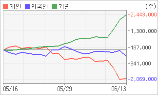 | 외국인과 개인은 순매도, 기관은 순매수(한달누적) 6월9일부터 전일까지 기관이 3거래일 연속 순매수했다. 4주간을 기준으로 보면 기관이 방향성있는 매매를 하면서 2,442,617주를 순매수한 반면, 외국인은 순매도로 돌아서면서 446,653주를 순매도했고, 개인들도 매도쪽으로 방향을 잡으면서 1,995,964주를 순매도했다. |