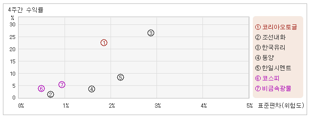 | 관련종목들 사이에서 변동폭은 작고, 상승률은 크고 14일 오전 10시55분 현재 전일대비 3.32% 오른 20,200원을 기록하고 있는 코리아오토글라스는 지난 1개월간 22.42% 상승했다. 같은 기간동안 위험정도를 말해주는 표준편차는 1.8%를 기록했다. 이는 코스피 업종내에서 주요종목들과 비교해볼 때 코리아오토글라스의 월간 주가수익률은 상당히 높았지만 변동성은 적정한 수준을 유지했다는 뜻이다. 최근 1개월을 기준으로 코리아오토글라스의 위험을 고려한 수익률은 12.4를 기록했는데, 변동성은 낮지 않았으나 주가수익률이 높았기 때문에 위험대비 수익률은 높은 수준을 나타냈다. 뿐만아니라 코스피업종의 위험대비수익률인 7.2보다도 높기 때문에 업종대비 성과도 좋았다고 할 수 있다. 다음으로 업종과 시장을 비교해보면 코리아오토글라스가 속해 있는 코스피업종은 비금속광물지수보다 변동성과 수익률이 모두 낮은 모습을 보여주고 있다. 다시 말해서 동업종의 탄력이 떨어지면서 업종상승률도 미진했다는 의미이다. |