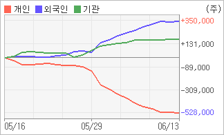 | 외국인/기관 순매수, 개인은 순매도(한달누적) 전일 외국인이 7,199주를 사들인 반면 기관은 507주를 팔았다. 4주간을 기준으로 보면 외국인이 초반에 동종목을 순매수한 이후에 기세를 이어가며 349,353주를 순매수했고, 기관도 방향성있는 매매를 하면서 178,407주를 순매수했다. 반면 개인들은 매도쪽으로 방향을 잡으면서 527,760주를 순매도한 것으로 나타났다. |