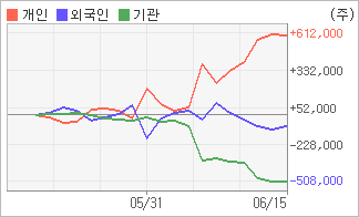 | 외국인과 기관은 순매도, 개인은 순매수(한달누적) 기관이 6일연속 주식을 팔고 있는 반면 외국인은 2일연속 주식을 사고 있다. 4주간을 기준으로 보면 외국인이 매도 우위를 지속하면서 88,507주를 순매도했고, 기관도 매도 관점으로 접근하면서 507,207주를 순매도했지만, 개인은 오히려 순매수량을 늘리며 595,714주를 순매수했다. |