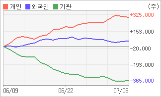 | 외국인/개인 순매수, 기관은 순매도(한달누적) 7월5일부터 전일까지 기관과 외국인은 2거래일 연속 동반 순매수를 보였다. 4주간을 기준으로 보면 외국인이 매수 우위를 유지하면서 54,193주를 순매수했고, 개인들도 순매수량을 늘리며 302,384주를 순매수했다. 하지만 기관은 매도 관점으로 접근하면서 356,577주를 순매도했다. |