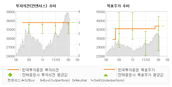 한국투자증권의 동종목에 대한 최근 1년동안의 투자의견은 전체적으로 큰 변화없이 유지되고 있다. 목표주가는 2016년6월 34,000원이 저점으로 제시된 이후 이번에 발표된 44,000원까지 꾸준하게 상향조정되어 왔다.