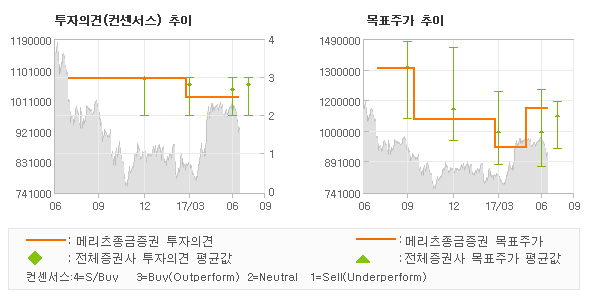 메리츠종금증권의 동종목에 대한 최근 1년동안의 투자의견은 전체적으로 조금 하향조정되고 있다. 목표주가는 2016년7월 1,350,000원까지 높아졌다가 2017년3월 960,000원을 최저점으로 목표가가 제시된 이후 최근에 1,150,000원으로 새롭게 조정되고 있다.