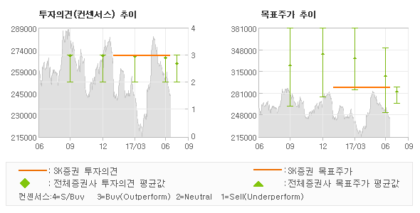 오늘 SK증권에서 발표된 '매수(유지)'의견 및 목표주가 290,000원은 전체의견에 수렴하면서 시장의 평균적인 기대감이 비교적 객관적으로 표현된 것으로 풀이되며 목표가평균 대비 6.7%정도 미달하고 있는 것으로 집계되었다. 참고로 최근에 목표주가를 가장 공격적으로 제시한 동부증권에서 투자의견 '매수(유지)'에 목표주가 350,000원을 제일 보수적인 의견을 제시한 한화투자증권에서 투자의견 'HOLD(유지)'에 목표주가 260,000원을 제시한 바 있다.