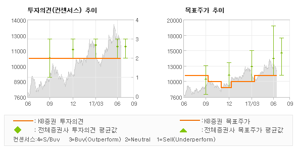 KB증권의 동종목에 대한 최근 1년동안의 투자의견은 전체적으로 큰 변화없이 유지되고 있다. 목표주가는 한때 2016년11월 9,000원을 저점으로 기록된 이후 최근에 11,000원까지 다시 상향조정되고 있다.