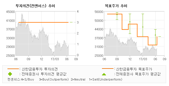 신한금융투자의 동종목에 대한 최근 1년동안의 투자의견은 전체적으로 큰 변화없이 유지되고 있다. 목표주가는 2016년7월 54,000원까지 높아졌다가 2017년5월 32,000원을 최저점으로 목표가가 제시된 이후 최근에 38,000원으로 새롭게 조정되고 있다.