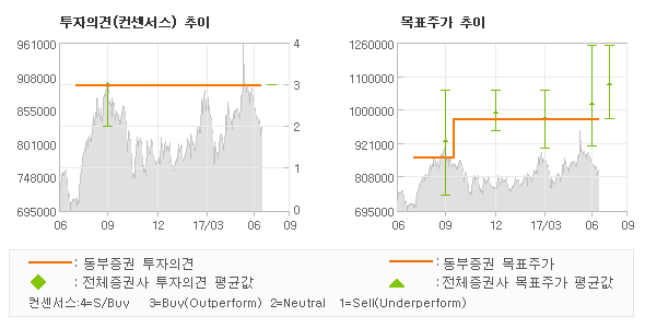 동부증권의 동종목에 대한 최근 1년동안의 투자의견은 전체적으로 큰 변화없이 유지되고 있다. 목표주가는 2016년6월 870,000원이 저점으로 제시된 이후 이번에 발표된 1,000,000원까지 꾸준하게 상향조정되어 왔다.