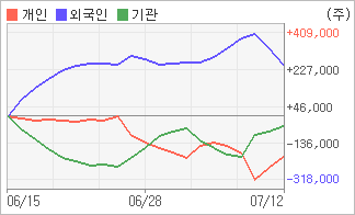| 기관과 개인은 순매도, 외국인은 순매수(한달누적) 전일 외국인이 83,359주를 사들인 반면 기관은 28,605주를 팔았다. 4주간을 기준으로 보면 외국인이 매수 우위를 유지하면서 252,666주를 순매수한 반면, 기관은 매도 우위를 보이면서 50,496주를 순매도했고, 개인들도 매도쪽으로 방향을 잡으면서 202,170주를 순매도한 것으로 집계됐다. |