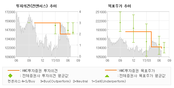 HMC투자증권의 동종목에 대한 최근 6개월 동안의 투자의견은 전체적으로 조금 하향조정되고 있다. 목표주가는 2016년11월 185,000원까지 높아졌다가 2017년5월 135,000원을 최저점으로 목표가가 제시된 이후 최근에 130,000원으로 새롭게 조정되고 있다.
