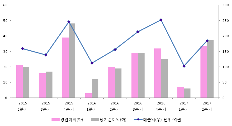 07월 20일 윈스(136540)의 2017년 2분기 개별 잠정 실적이 발표됐다. 전년 동기 대비해서 매출액, 영업이익, 당기순이익 모두 증가하였다. 156억원이었던 매출액은 18.1% 증가하여 185억원을 기록했다. 영업이익은 69.4% 상승하여 33.8억원이고, 당기순이익은 37.1억원으로 발표됐다.