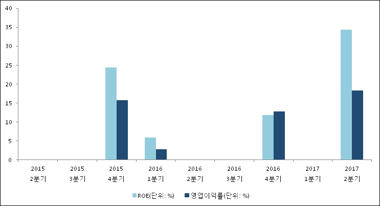 이번분기 기준으로 추정되는 윈스의 자기자본이익률(ROE)은 11.8%로 나타났다. 이는 최근 일년과 비교했을 때 급등한 수치이다. 전년 동기인 2016년 2분기 ROE는 24.4%로 이번 분기에 12.6%p 하락했다. 한편 동종목의영업이익률은 12.8%이다. 이는 최근 일년과 비교했을 때 급등하였다. 2분기 매출액, 영업이익 모두 상승했는데, 영업이익의 상승폭이 더 컸기 때문에 영업이익률이 상승했다. 지난해 동기 영업이익률은 15.8%로 이번 2분기에 3%p 하락했다.