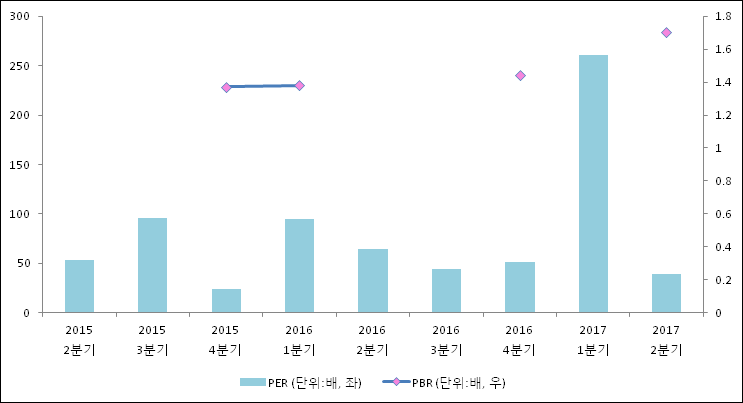 주가가 1주당 수익의 몇배가 되는지 나타내는 주가수익비율(PER)은 39.61배로 나타났다. 전년 동기 PER은 64.55배로 이번 분기에 하락했다.주가가 1주당 순자산의 몇배인지 알려주는 주가순자산비율인 PBR은 1.44배이다. 최근 1년 대비 이번 분기 PBR은 급등했다. 지난해 동기 PBR은 1.37배로 이번 분기와 비슷한 수치이다.
