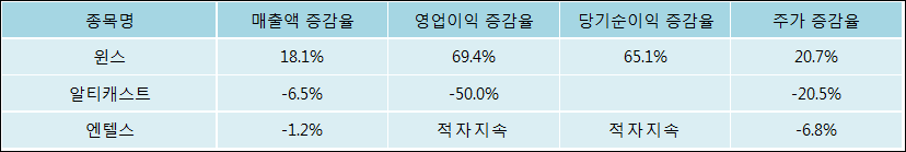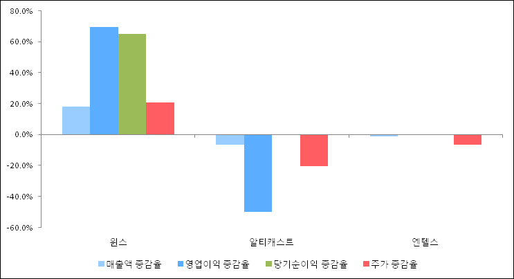 다음은 윈스와 동일 업종 내 비교 그룹 종목의 각각 최근 실적의 전년 동기 대비 성장률이다. 윈스의 매출액 증감율은 타 종목 대비 가장 우수한 편이다. 그리고 주가는 가장 높은 상승률을 보였다.
