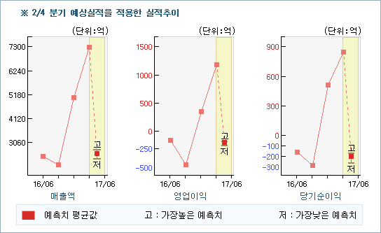 씽크풀 리서치센터가 집계한 마켓 컨센서스에 따르면 이번분기 예상실적 범위는 매출액 2,357억원 ~ 2,753억원, 영업이익 -140억원 ~ -73억원, 당기순이익 -260억원 ~ -166억원으로 각각 집계되었는데, 유진투자증권의 추정치는 특히 컨센서스(평균)대비 당기순이익을 4.82% 높게 예상하고 있어서 향후 수익성에 대한 의견이 시장의견보다 매우 공격적인 것으로 평가된다.