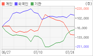 | 기관과 개인은 순매도, 외국인은 순매수(한달누적) 7월13일부터 기관이 8거래일 연속 순매수 행진을 벌이고 있다. 4주간을 기준으로 보면 외국인이 초반에 동종목을 순매수한 이후에 기세를 이어가며 140,233주를 순매수한 반면, 기관은 매도 우위를 보이면서 38,649주를 순매도했고, 개인들도 매도 우위로 반전되면서 101,584주를 순매도한 것으로 집계됐다. |