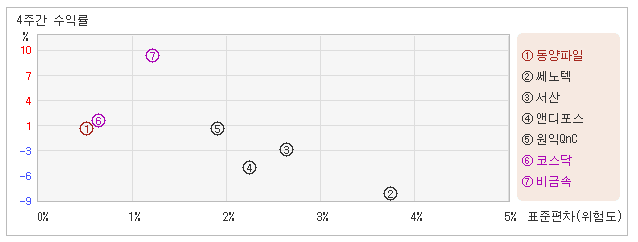 | 업종평균에 비해서 변동폭 대비 수익률은 다소 부정적 25일 오전 11시20분 현재 전일대비 0.82% 하락한 7,300원으로 보합권에 머물러 있는 동양파일은 지난 1개월간 0.41% 하락했다. 같은 기간동안 변동성의 크기를 말해주는 표준편차는 0.5%를 기록했다. 이는 비금속 업종내에서 주요종목들과 비교해볼 때 동양파일의 주가가 월간기준으로 선방했던 모습을 보임과 동시에 변동성도 가장 낮았다는 뜻이다. 최근 1개월을 기준으로 동양파일의 위험을 고려한 수익률은 -0.8을 기록했는데, 주가는 하락했어도 변동성이 가장 낮은 상태로 유지되었기 때문에 위험대비 수익률은 높은 수준을 유지했다. 다만 비금속업종의 위험대비수익률 7.7보다는 낮았기 때문에 업종대비 성과는 뛰어났다고 할 수 없다. 다음으로 업종과 시장을 비교해보면 동양파일이 속해 있는 비금속업종은 코스닥지수보다 변동성과 수익률이 모두 높은 모습이다. 다시 말하면 동업종에 탄력이 붙으면서 지수대비 초과상승했다는 의미이다. |