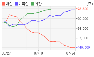 | 외국인/기관 순매수, 개인은 순매도(한달누적) 7월19일부터 전일까지 외국인이 4거래일 연속 순매수를 보였다. 4주간을 기준으로 보면 외국인이 초반에 동종목을 순매수한 이후에 기세를 이어가며 67,156주를 순매수했고, 기관도 방향성있는 매매를 하면서 72,539주를 순매수했다. 반면 개인들은 매도쪽으로 방향을 잡으면서 139,695주를 순매도한 것으로 나타났다. |