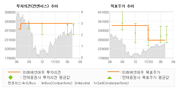 미래에셋대우의 동종목에 대한 최근 1년동안의 투자의견은 전체적으로 큰 변화없이 유지되고 있다. 목표주가는 2016년7월 356,000원까지 높아졌다가 2017년3월 275,000원을 최저점으로 목표가가 제시된 이후 최근에도 275,000원으로 제시되고 있다.