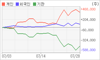 | 외국인/개인 순매수, 기관은 순매도(한달누적) 전일 기관이 105,735주를 순매수했고, 외국인은 35,313주를 순매도했다. 4주간을 기준으로 보면 외국인이 초반에 동종목을 순매수한 이후에 기세를 이어가며 84,930주를 순매수했고, 개인들도 순매수량을 늘리며 396,799주를 순매수했다. 하지만 기관은 매도 관점으로 접근하면서 481,729주를 순매도했다. |