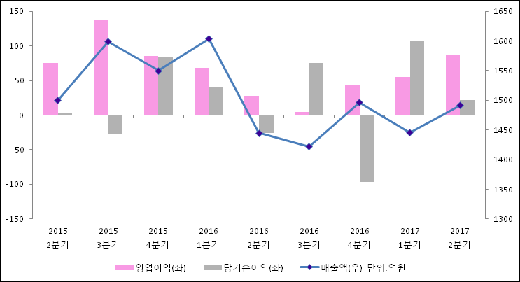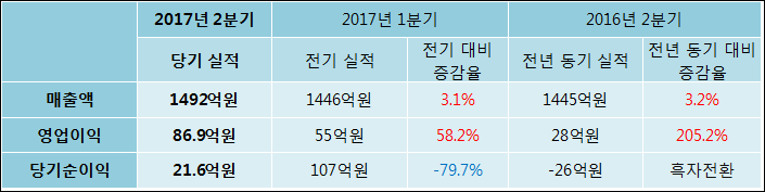 07월 31일 무림P&P(009580)의 2017년 2분기 개별 잠정 실적이 발표됐다. 전년 동기 대비해서 매출액은 3.2% 상승하여 1492억원을 기록했다. 영업이익은 205.2% 상승하여 86.9억원을 기록했다. 당기순이익은 -26억원에서21.6억원으로 흑자전환되었다.