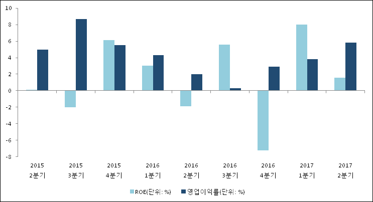 이번분기 기준으로 추정되는 무림P&P의 자기자본이익률(ROE)은 1.6%로 나타났다. 전년 동기인 2016년 2분기 ROE는 -1.9%로 이번 분기에 3.5%p 상승했다. 한편 동종목의영업이익률은 5.8%이다. 최근 3분기 이상 꾸준히 상승하는 추세이다. 지난해 동기 영업이익률은 2%로 이번 2분기가 3.8%p 상승했다.