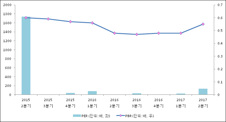 주가가 1주당 수익의 몇배가 되는지 나타내는 주가수익비율(PER)은 136.42배로 나타났다. 직전분기 PER은 24.15배로 이번 분기에 상승했다.주가가 1주당 순자산의 몇배인지 알려주는 주가순자산비율인 PBR은 0.55배이다. PBR은 최근 1년동안 큰 변동 없이 비슷한 수치를 보이고 있다. 지난해 동기 PBR은 0.48배로 이번 2분기 PBR이 상승했다.