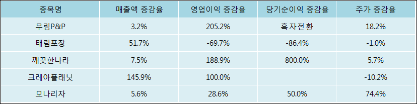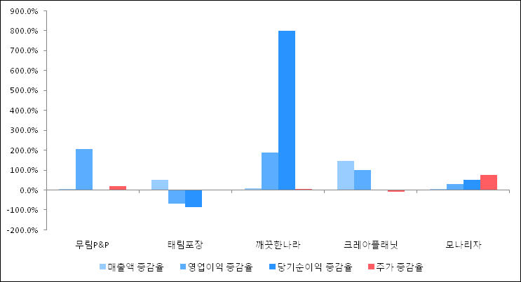 다음은 무림P&P와 동일 업종 내 비교 그룹 종목의 각각 최근 실적의 전년 동기 대비 성장률이다. 무림P&P의 매출액은 증가했지만 증감율은 타 종목 대비 가장 저조한 편이다. 그리고 주가 상승률은 높은 편이다.